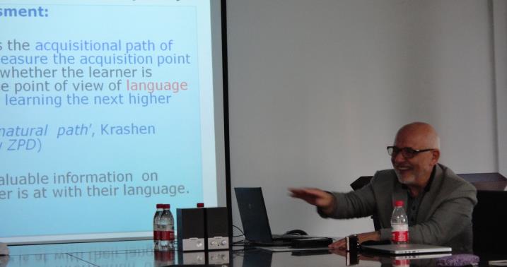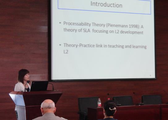 Bruno Di Biase博士与Satomi Kawaguchi 博士是二语习得可加工理论(PT理论)研究领域的杰出代表。Di Biase博士与该理论的创始人Pienmann被称为“可加工性理论的开拓者和发展者”。可加工性理论是Pienemann于1998年提出的二语习得领域的一个新理论。其研究重点是语言信息加工机制( Processing mechanism)是如何影响语言发展进程的。该理论的提出刺激了一系列领域的新研究, 如心理语言学、教育学等等。27日下午 Satomi Kawaguchi博士首先介绍了该理论发展的历史渊源及其在英语教学的应用,包括该理论在句子生成中句法-语用相互作用的技能习得的最新进展,以及从可加工性理论视角设计二语教学大纲和教学任务,以促进成功的二语教学。 Bruno教授随后就和可加工性理论所涉及的二语句法发展的两个假(显著性假设和词汇映射假设)进行了深入浅出的介绍。在讲座中,两位教授分别用自己实施的实证研究成果诠释该理论的本质及其优势。