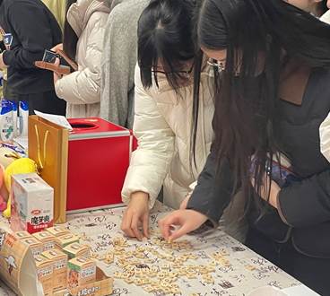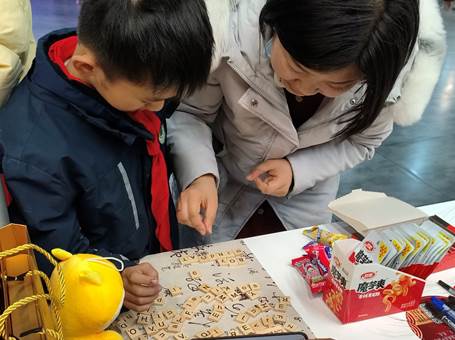 参与者手持长筷,从装满字母乒乓球的箱子中精准夹取对应字母,放入碗中,正确补充出题板上的单词,动手又动脑,现场紧张又充满乐趣。