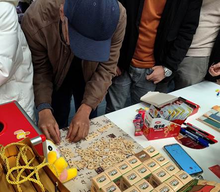 这是一场对大家的词汇储备和拼写能力的考验。桌上杂乱摆放的字母,在限时一分钟内要拼出六个四个字母以上的单词,这让不少同学直呼 “烧脑”却又乐此不疲。大家争分夺秒,手指在字母间飞速舞动,在紧张的氛围中提升了英语拼写技巧。