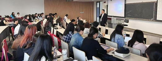 中国外文局翻译院来访期间,黄玉龙院长还为学院师生做了题为“加快应用型人才培养,投身新时代国际传播实践”的专题讲座。他深入剖析国际形势,结合自身丰富的实践经验,强调国际传播是当代外语人责无旁贷的历史使命。他指出,新时代国际传播工作需区分静态和动态,要兼顾渠道与内容。在国际传播实践中,外语是基础,专业是支撑,文化是关键。他勉励同学们积极投身国际传播实践,为提升新时代中国国际传播能力不懈奋斗。讲座尾声,黄玉龙院长解答了同学们关于国际传播策略和AI技术应用的疑问。互动环节气氛热烈,同学们纷纷表示深受鼓舞和启发。