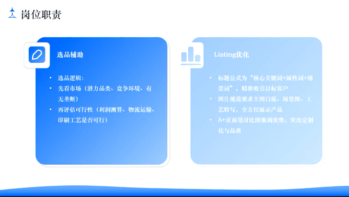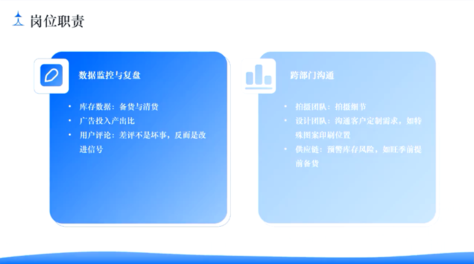 接下来,赵一霖详细分享了自己的岗位职责,分别是选品辅助、Listing优化、数据监控与复盘以及跨部门沟通,在日常工作中会通过用户差评或数据分析发现并解决产品尺码问题、库存问题等。