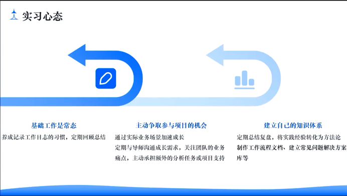 在实习的过程中,首先要认真地对待基础性的工作,这些工作是积累经验的重要途径。其次要主动争取参与项目的机会,定期与导师沟通自己的成长需求,关注团队的业务痛点,承担一些额外的分析任务或者是项目支持。最后就是要建立自己的知识体系,养成记录工作日志的习惯,定期进行回顾和总结。