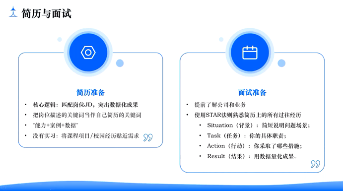 最后,赵一霖根据自身经验给大家分享了一些实习建议。首先,要重点关注岗位的描述,仔细研读实习职位要求中的关键词,撰写简历时就要突出与关键词的匹配度,采用“能力+案例+数据”的表达方式,即使没有相关的实习经历,也可以通过项目或者是校园经历来贴近这个岗位的需求。其次,在面试的准备环节,要通过公司官网,行业报告以及新闻报道等渠道来了解应聘公司的商业模式,产品特点,市场定位。在面试时,也要善于将自己的能力与工作需求相匹配,可以运用STAR法则熟悉简历上的过往经历。