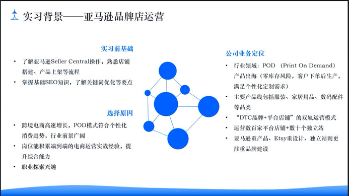 在实习背景部分,赵一霖主要分享了实习前如何了解电商行业发展及其运营模式,目前所实习公司的业务定位以及自己选择互联网跨境电商实习的原因。赵一霖特别说明了虽然目前实习的公司并不属于传统的互联网大厂,但作为一个比较新的企业,会拥有更加开放和活跃的工作氛围,鼓励员工自由地表达观点。其次,公司的管理结构也较为扁平化,能够让员工更加深入地了解跨境运营的全部流程。