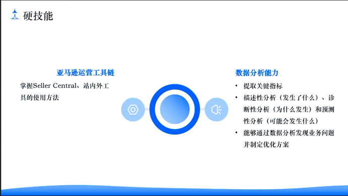 随后,赵一霖分享了这段实习经历让她在两个维度有了显著的提升。硬技能方面,她掌握了亚马逊后台的操作流程,比如批量上传广告组的优化,运用站内外的工具进行选品价格追踪和监控等;另外,她的数据分析能力也有所提升,学会了怎样运用描述性分析、诊断性分析和预测性分析发现业务问题并制定优化方案。
