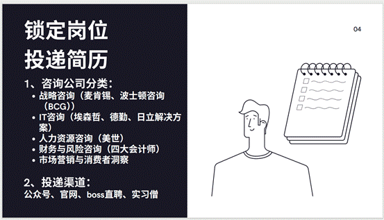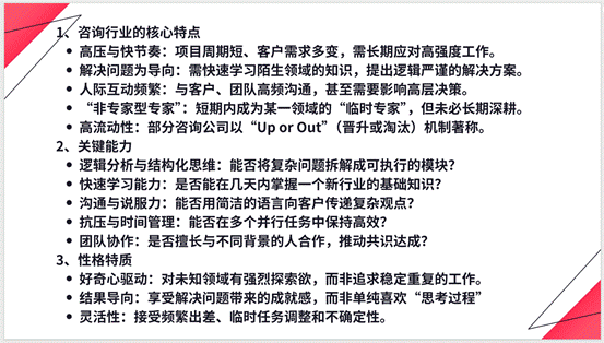 最后郭文静总结道,这段咨询行业的实习经历让她深刻体会到,咨询工作既需要战略层面的全局思维,也离不开执行环节的极致细节把控。她强调,咨询行业涵盖众多细分方向,不同领域对技能的要求各有侧重——战略咨询强调逻辑框架与行业洞察,数据分析依赖建模与可视化能力,而跨境业务则考验跨文化沟通与本地化执行力。她建议感兴趣的同学结合自身优势选择赛道,如擅长文本解构者可深耕日企市场进入策略研究。