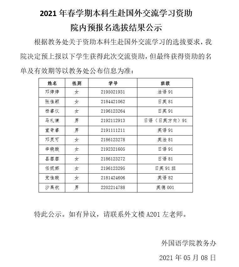 2021年春学期本科生赴国外交流学习资助院内预报名选拔结果公示