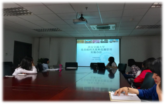 党员组织关系和党籍管理实施办法》。在学习《发展党员工作流程》过程中,支部党员褚莞儿同志分享了自己高三时在少数民族地区入党的经历。褚莞儿回忆说,上党课、背党章、准备各项材料、考试、面试,都是每个入党积极分子必须完成的事项,曾经有位同学能一字不落地背诵党章。因此,入党不易,每位党员都应该为自己是一名中共党员而自豪,践行为人民服务宗旨,严以律己,做好党员的模范带头作用。其次,为了给即将毕业的党员答疑解惑,余碧燕同志详细介绍了转党员组织关系的相关注意事项,并针对同学们提出的问题进行了解答。