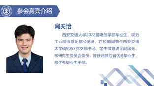 本次活动邀请到了电信学部2022届毕业生闫天怡,在校期间,他曾获评陕西省优秀毕业生、校优秀毕业生干部,目前为工业和信息化部公务员。