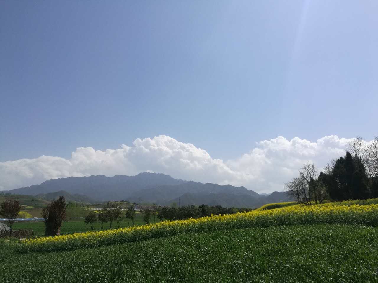 就在距离这“白鹿村”不远的地方,更往终南山脚下前进一点,却是另外一种春意盎然。这里没有历史的厚重感,而是悠然见南山的人与自然的和谐感。这里沃野千顷,村庄点点,绿树绕田,色彩层染。这就是本次远足的第二站,号称东方普罗旺斯的蓝田鲍旗寨村。虽然油菜花已没有月初那样的亮黄,薰衣草也只是含苞未放,但是黄绿相间的田野、童话小屋般的农户、魏然而起的南山、纯净的蓝天组成的清澈画面是久居城市的人平日里无法赏鉴的。身处其中,能感受到的正是钢筋水泥丛林里蜗居的人们心心相念的那份轻松、自由感。