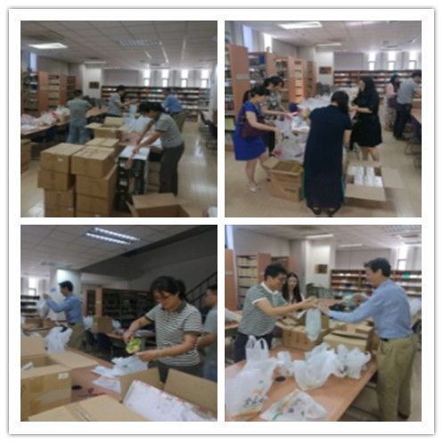 由于品种较多,商家发来的统一包装需要根据各系中心的教职工人数进行分装。在学院一楼的资料室里,许多教师加入了分装服务行列,在此要特别感谢邓娟涛、刘艳菊、郑青、李雅丽、于丛聪等几位老师的热心帮助,以及各位工会老师、组长和数位系中心老师们的辛勤搬运。有了这些老师的热心,使得今天的福利慰问品发放效率很高。我院教师在今天上午就直接可以拿到学校和学院今年端午节的福利慰问品。