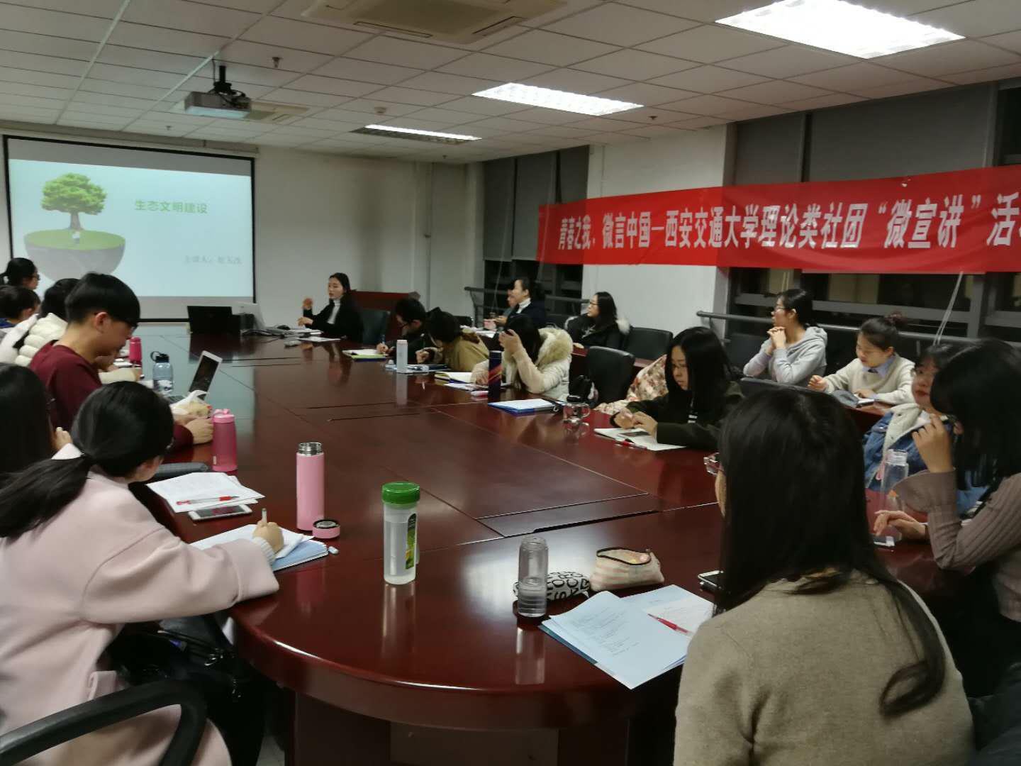 宣讲活动伊始,来自春秋社的黄楚珉与同学们分享了四个小故事讲述交大精神。这四个小故事围绕交大校史,追溯到交大建校之初,创办南洋公学而兴学;抗战时期,从沪迁出到渝,创办新专业,肩负天下兴亡;西迁长安,建设西北,向科学进军;新时期,服务国家,争创世界一流。随后交大马列读书社的崔玉改同学宣讲了生态文明建设的有关内容。她别出心裁,通过视频放映和照片对比,结合十九大报告中生态文明建设的部分和自己亲身体会,呼吁同学们环境保护从一点一滴日常小事做起。