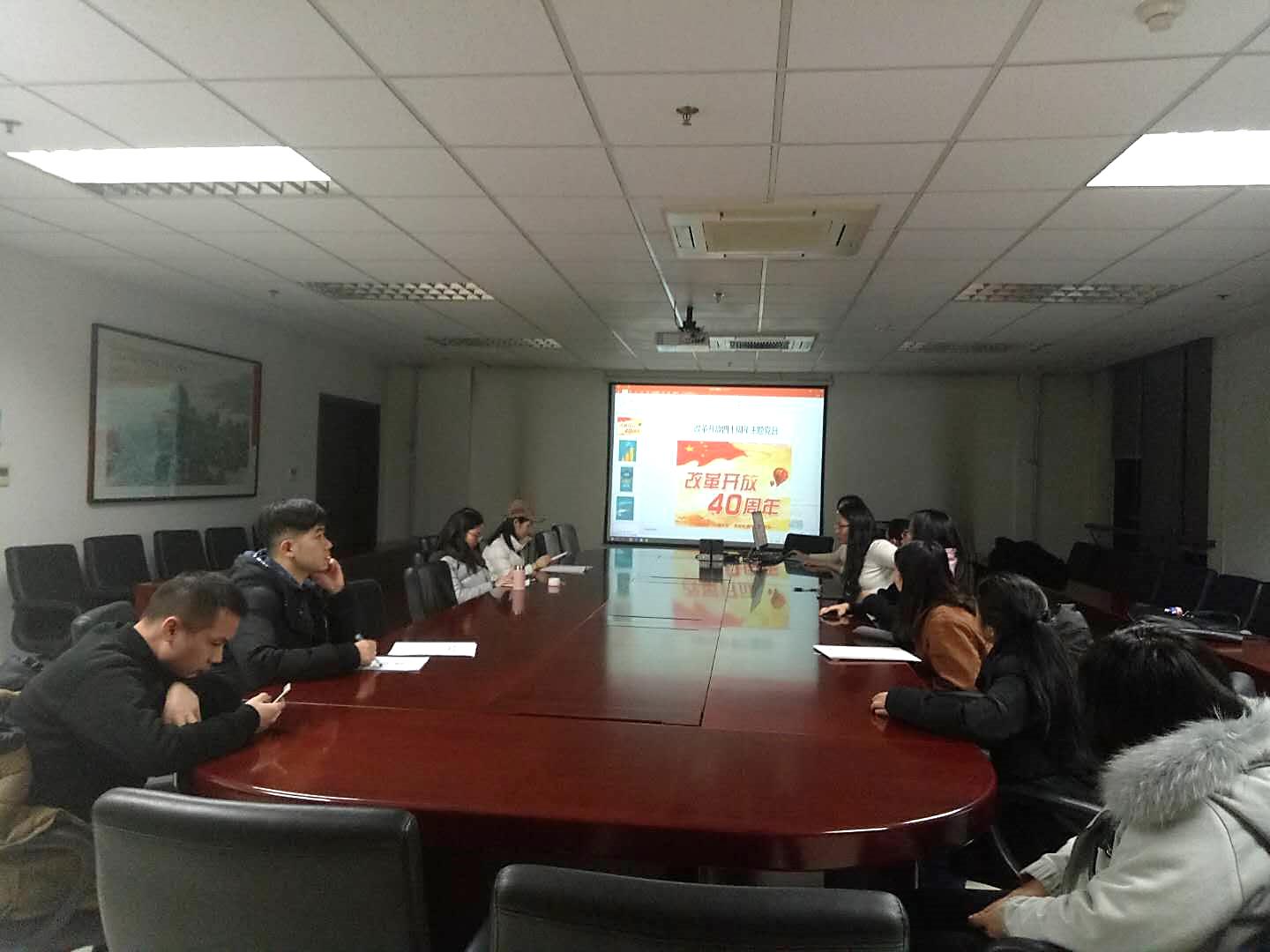 首先,党支部书记朱海博带领大家学习了庆祝大会的会议精神。大家观看并学习了改革开放四十年的光辉历程以及优秀经验。过去40年辉煌成就的取得,最重要的就是坚持中国共产党的领导,坚定不移地走中国特色社会主义道路,坚持马克思主义的指导。对于本次会议精神学习,大家感触颇多。张静说:“有中国共产党强有力的领导,才能带领我们国家和人民取得这样卓越的成就,所以党的建设要和国家发展同向同行,坚持马克思主义的领导,这样才能坚定不移的深化改革开放。”王闵利表示:“中国人民自己乃至世界都见证了过去40年中国的变化,经济发展飞速,经济实力居世界前列,给欧美国家带来很大挑战,文化上世界各地建立的孔子学院成为传递中国文化,增进中国和世界各国文化交流的桥梁,很多人将汉语作为第二外语。”韩梦卓认为,改革开放以来,中国制造十分瞩目,但是我们更要注重提高创新意识,同时要大力提高文化软实力。