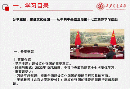 硕3123班党支部召开了专题为“贯彻学习二十届中共中央政治局第十七次集体学习重要讲话精神”的组织生活。本次活动旨在深入学习习近平总书记关于文化强国建设的重要讲话,提升党员的思想意识,增强支部成员的责任感和使命感,为推进文化强国建设贡献力量。会议由支部书记王嘉慧主持,支部全体成员及新发展的入党积极分子参加了会议。