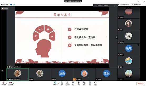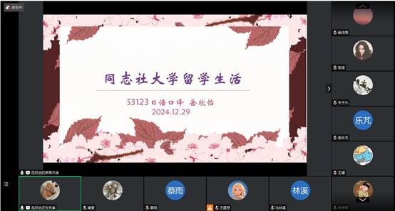 会议进入第二部分,支部成员分享实习/留学生活,增进相互学习和启迪。首先,岳欣怡同志分享了她在日本的留学生活。岳欣怡同学目前在同志社大学留学,她为支部成员们详细介绍了在日本留学的所观所感,也分享了在日本遇到的一些潜在危险,提醒同学们要时刻注意政治立场,不乱接传单,在异国参观也要了解景区背景。