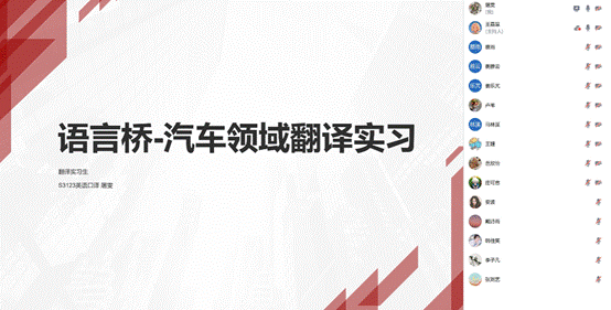 接着,屠雯同志分享了她的实习经验。她目前在语言桥做汽车领域翻译实习。她的项目任务是为多个大厂客户,如比亚迪,做汽车领域相关的笔译,翻译内容涉及一些专业术语,这也是该翻译项目的难点所在。屠雯同志总结了翻译过程中所遇到的困难与挑战,强调了检查术语是否准确的重要性,以确保翻译质量并减少错误。