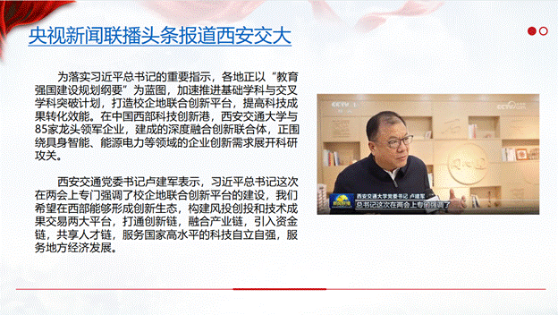 党委书记卢建军在接受央视《新闻联播》采访时的表述。卢建军表示,习近平总书记这次在两会上专门强调了校企地联合创新平台的建设,我们希望在西部能够形成创新生态,构建风投创投和技术成果交易两大平台,打通创新链,融合产业链,引入资金链,共享人才链,服务国家高水平的科技自立自强,服务地方经济发展。
