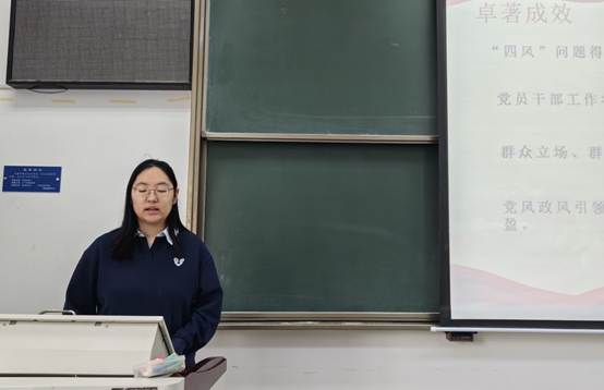 会议伊始,李雨檬同学作专题汇报,围绕中央八项规定的核心内容、贯彻执行的成果及新时代大学生的责任展开讲解。她提到,中央八项规定从调查研究、会议活动、勤俭节约等多个方面立规矩、正风气,为全面从严治党奠定了基石。十余年来,党中央坚持以上率下,从严纠治“四风”,推动党风政风持续向好。作为大学生,作风建设不仅关乎党员干部,也关乎每个青年人的精神风貌。大学生应加强理论学习,培养求真务实、艰苦奋斗的品格,真正做到“知行合一”。