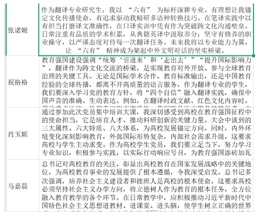 祝格格同志表示:“翻译是实现教育对外开放、参与全球教育治理的关键工具。作为翻译专业的学生,我们要深入学习党的教育方针,将“四个自信”融入翻译实践,确保中国声音的准确、生动表达。”