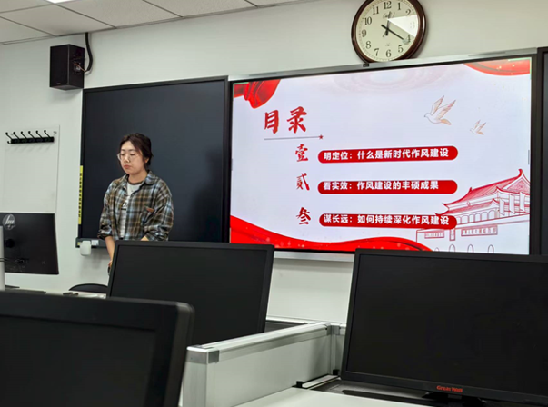 随后,张庭鹤同学围绕中央八项规定精神展开“以好作风护航新征程”的领学汇报。创新采用“生命线、看实效、谋长远”三幕式:开篇以“自我革命”当锚,阐明中央八项规定是新时代作风建设的“纲要”;征途以“基层作风”为浆,“短会下沉”“审批提速”“送服务上门”等鲜活案例展现党员作风之变已转化为群众获得感、群众幸福感;尾声以“展望未来”作帆,用制度“铁牙齿”咬住问题、用数字赋能提质增效、用脚步丈量民情。生动诠释我党优良作风如何常态长效。正常汇报逻辑严密、案例鲜活,既有理论高度,又有实践温度。